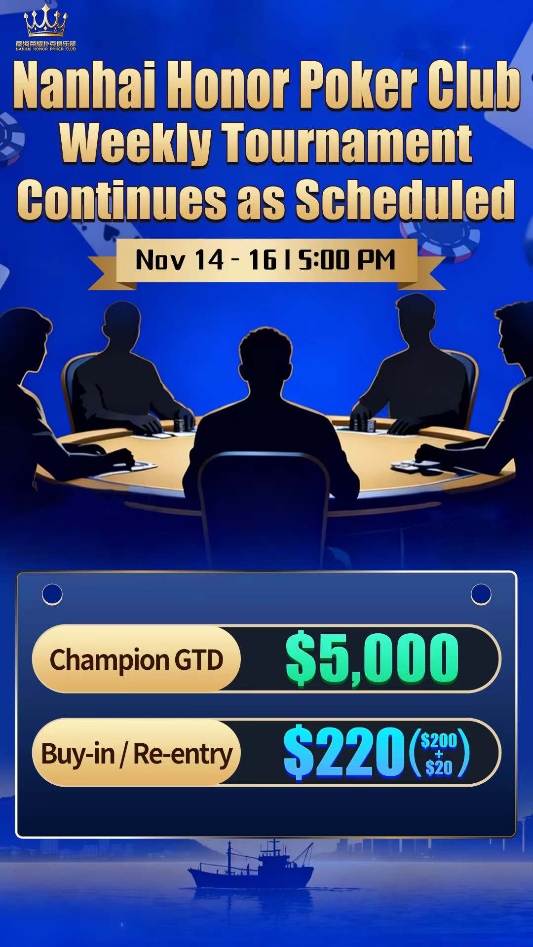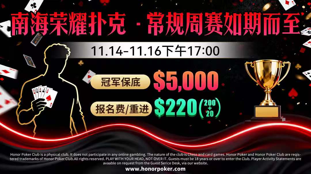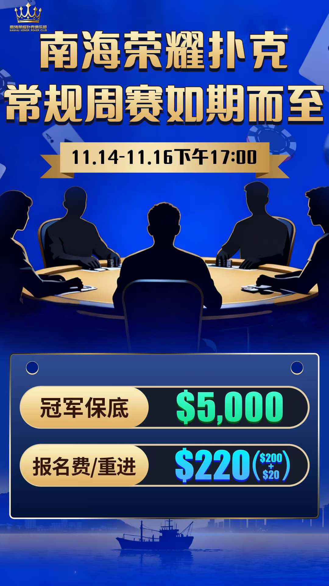 南海荣耀扑克周赛回归|💰$220报名,保底$15,000⏰ 本周赛期:11月8日-9日 · 冠军独享 $5,0…